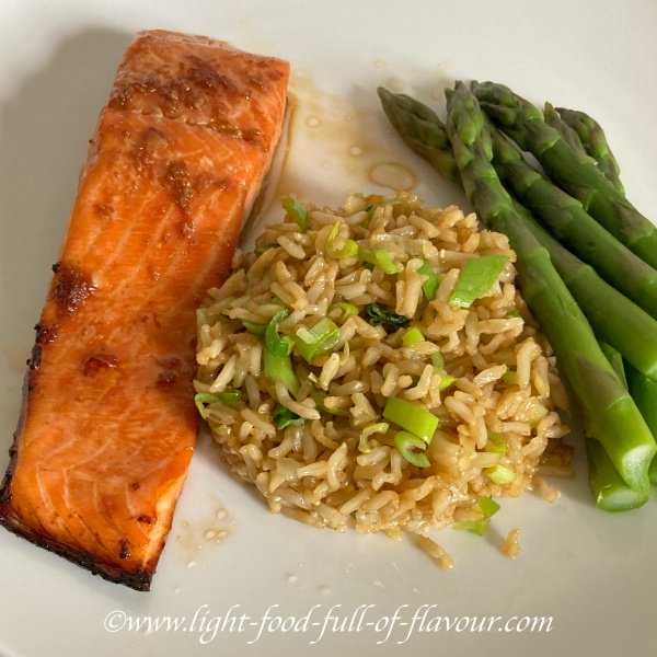 I'm using dry sherry in the marinade, but you can also use Japanese sake, or Shao Xing cooking wine. The most common oil to use for stir-fries is vegetable oil, but I avoid this unhealthy oil as much as possible. I use either avocado oil or Extra virgin olive oil. Avocado oil has a much higher smoke point, so it is my preferred choice. I serve this dish with lightly cooked asparagus and/or broccoli. Teriyaki Marinade: 3 tablespoons Japanese soy sauce (I use tamari soy sauce) 2 tablespoons dry sherry 1 tablespoon clear honey 1 large garlic clove - crushed/minced Mix all the ingredients together in a bowl. 4 salmon fillets Place the salmon fillets in dish and coat the fillets with the marinade. Cover and place in the fridge for an hour. 200g, 7oz, 1cup, brown basmati rice - cook according to instructions (usually between 25- 30 minutes) in salted water. Leave to the side once done. 2 tablespoons avocado oil, or use vegetable oil 1 heaped tablespoon finely chopped fresh ginger black pepper 4 spring onions/scallions - sliced Asparagus and/or broccoli
