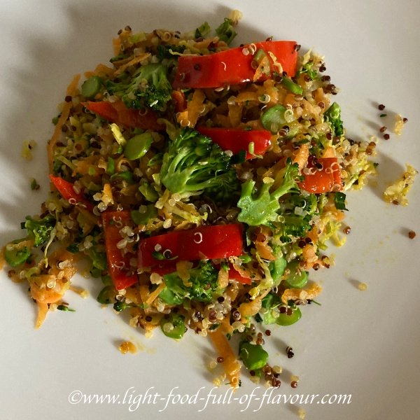 5 broccolini/tenderstem broccoli spears, finely sliced 5 Brussel sprouts, finely sliced 1/2 small sweet potato, coarsely grated 1/2 red pepper/bell pepper, sliced 1 garlic clove, finely chopped 1 teaspoon ground ginger 1/4 teaspoon sea salt Black pepper 1/2 cup, 75g cooked quinoa Heat up some oil in a wok or frying pan and once the oil is hot, add all the vegetables, ground ginger, salt and some black pepper and stir-fry for 2 minutes. Add the cooked quinoa and continue to stir-fry for another minute until everything is piping hot.